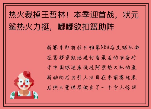 热火裁掉王哲林!本季迎首战,状元鲨热火力挺,嘟嘟欲扣篮助阵