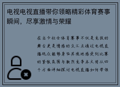 电视电视直播带你领略精彩体育赛事瞬间,尽享激情与荣耀