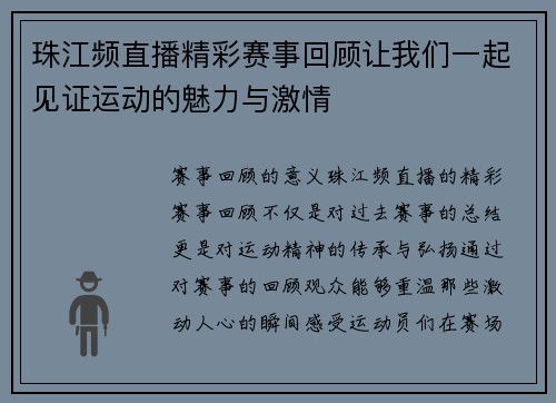 珠江频直播精彩赛事回顾让我们一起见证运动的魅力与激情